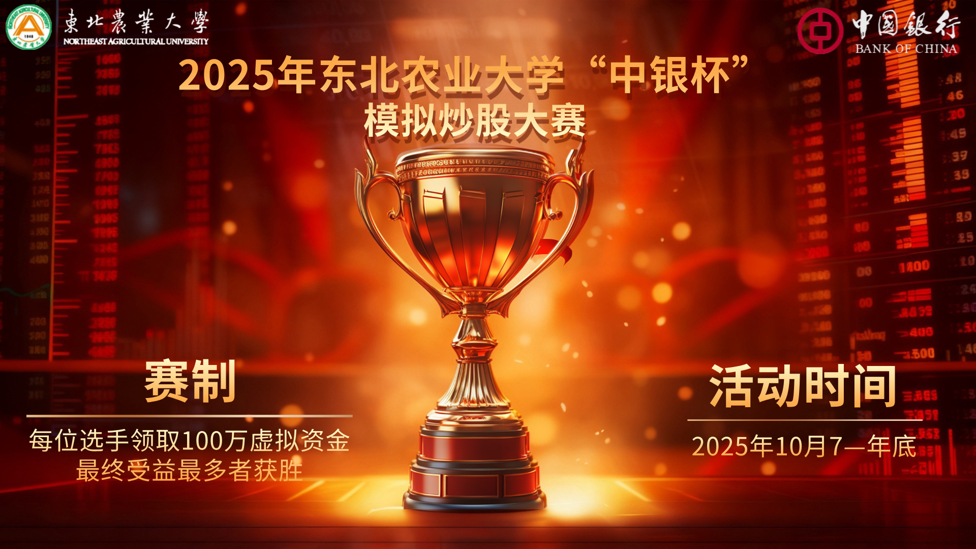 赛事简介:为提升在校学生金融数据分析与实战能力,树立理性投资理念,增强风险防范意识,促进理论与实务相结合。中国银行黑龙江省分行与中银黑龙江分公司及东北农业大学联合举办2025年东北农业大学“中银杯”大学生模拟炒股大赛。